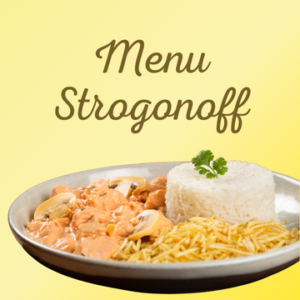 Strogonoff de frango acompanhado de arroz e batata palha.
