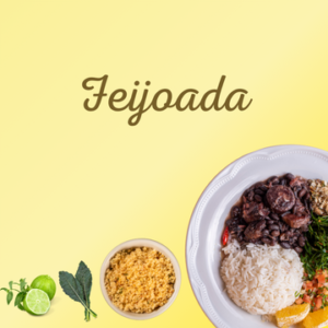 Arroz Branco, Feijoada (costela suína, pernil salgado, linguiça calabresa e paio, carne seca), Couve refogado e Farofa.